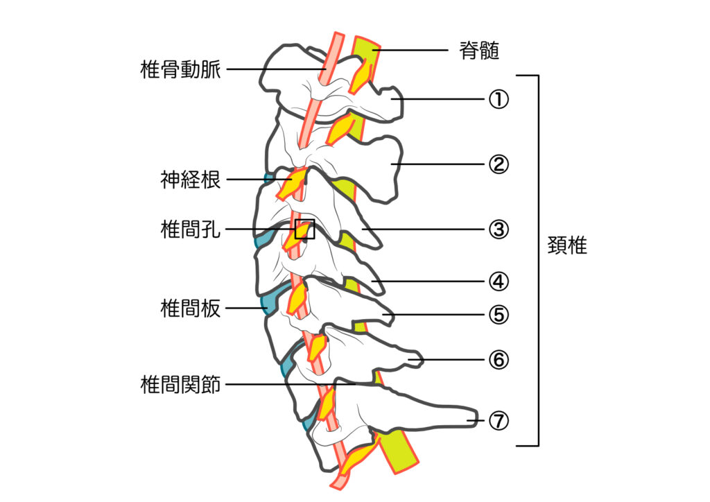 一つ目は、首の骨(頸椎)の間で神経が圧迫されるタイプです。デスクワークなどで首が前に出た姿勢(ストレートネック)が続くと、首の骨の間が狭まり神経を圧迫しやすくなります。