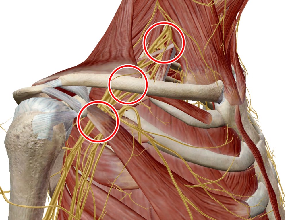 二つ目は、首から腕へ伸びる神経が筋肉や鎖骨、肋骨周辺で圧迫されるタイプ(胸郭出口症候群)です。肩や腕の筋肉が緊張しやすい現代人にとって決して珍しい症状ではありません。